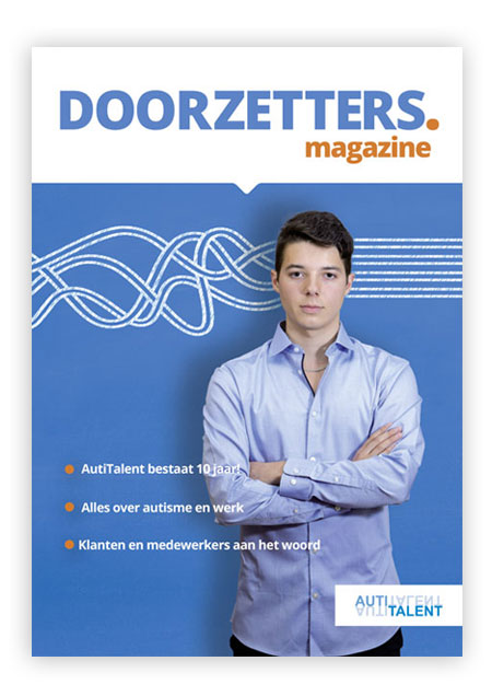 Ter ere van ons 10-jarige jubileum hebben wij een magazine uitgegeven. Een magazine over én voor doorzetters, met artikelen over het ontstaan van AutiTalent, onze medewerkers en klanten, werkwijze en impact.